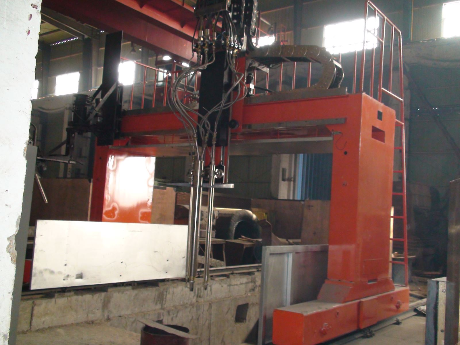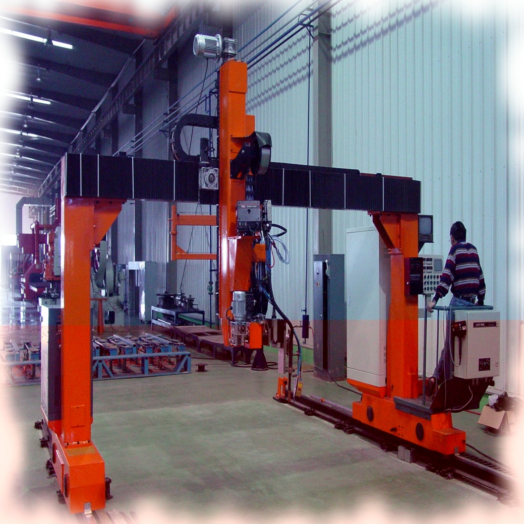 ● 龍門(mén)所配二臺(tái)焊機(jī)、保護(hù)氣氣瓶(至少2個(gè))、控制柜等均放在龍門(mén)兩側(cè)托架上,隨龍門(mén)一起移動(dòng),進(jìn)龍門(mén)的外部供電線(xiàn)纜采用滑線(xiàn)供給,使得龍門(mén)移動(dòng)范圍加大。